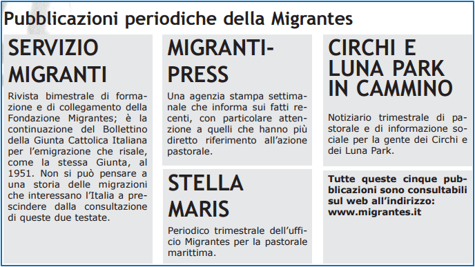 +Stampa periodica di Migrantes ed altri compendi come i Quaderni di “Servizio Migranti”. I Direttori dei cinque settori, per favorire una “pastorale d’insieme”, si incontrano col Direttore Generale della Migrantes almeno due volte al trimestre.